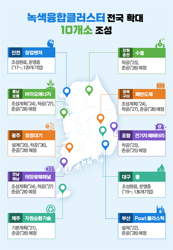 지역의 특성에 맞춰 탄소경쟁력을 강화해 지역 활성화를 돕기 위해 전국 권역별 10곳을 지정해 녹색융합클러스터를 조성한다. 인천서구(창업벤처), 대구(물), 포항 블루밸리(전기차 폐배터리), 부산 생곡(Post-플라스틱), 광주(청정대기), 구미(폐반도체), 해남(태양광 폐패널), 보령(바이오에너지), 제주(자원순환기술), 춘천(수열) 등이다. 추후 탄소중립도시도 10곳을 선정해 지역주도 탄소중립 특화모델을 구축한다.
