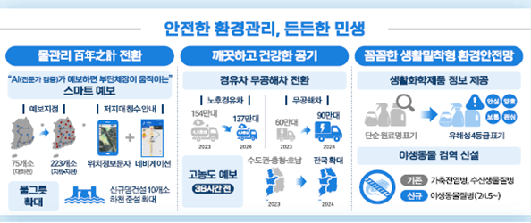 먼저 '국민안전'을 위해 홍수기를 앞둔 오는 5월부터 인공지능(AI) 예보를 75개 대하천 본류 중심에서 전국 지류·지천 포함 223개소로 확대한다. 동시에 해수담수화, 섬·산간 지역 지하수 저류댐 등 다양한 대체 수자원을 개발해 물 부족 지역에 공급한다. 녹조 사전예방을 위해 야적퇴비 수거사업을 낙동강 외 전체 하천으로 확대해 가축분뇨 등 주요 오염원을 집중관리한다. 상습 발생지역에는 녹조 제거선 등 장비를 확충한다.
