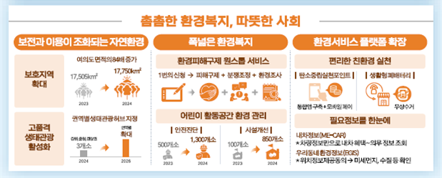 끝으로 '환경서비스'는 환경보전과 환경데이터에 관한 내용을 담고 있다. 환경부는 2030년까지 생태관광지와 같이 보전과 이용이 조화되는 곳을 중심으로 2030년까지 국토의 30%를 보호지역 및 자연공존지역으로 지정할 계획이다. 자연공존지역은 보호지역과 같은 규제는 없으나 보전에 기여하고, 관리되는 지역이다. 2024년 보호지역과 자연공존지역의 면적을 전년보다 여의도 면적의 84배인 245㎢로 늘려 1만7750㎢를 확보한다.