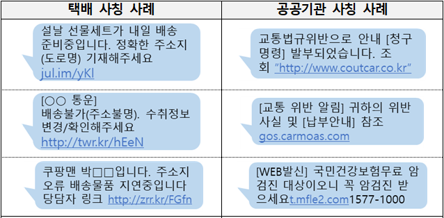 설 명절 전후로 교통 범칙금 납부고지 등 공공기관을 사칭하거나 명절 안부 인사, 경조사 알림, 설 선물배송 등을 위장한 스미싱 메시지가 크게 증가할 것으로 예상되기 때문에 의심가는 메시지 속 웹주소(URL)나 전화번호를 절대 누르지 말고 메시지를 반드시 삭제해야 한다. 또 가족, 지인 등을 사칭하는 메신저피싱의 경우 상대의 요구에 응하지 말고 전화를 끊거나 메시지를 무시해야 한다.