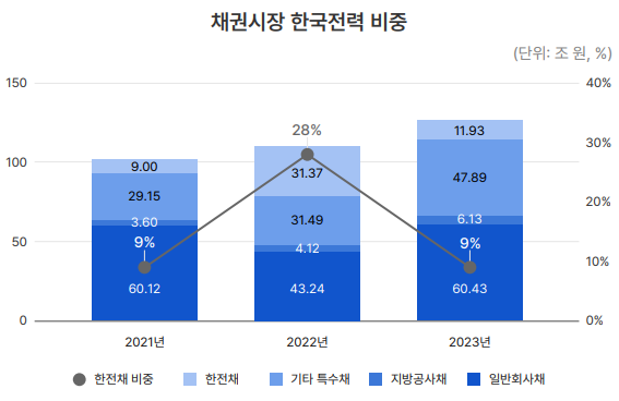 지난 2년간 누적적자가 50조원에 달한 한전은 채권발행을 지속해왔다. 2022년 31조원이 발행된 한전채는 채권발행시장에서 차지하는 비중이 2021년 9%에서 2022년 29%로 급증했다. 한전이 짧은 기간에 한정된 자금공급을 독점하자 일반회사채 발행량은 2021년 60조원에서 2022년 42조원으로 30% 감소해 기업 자금조달을 위축시켰다.