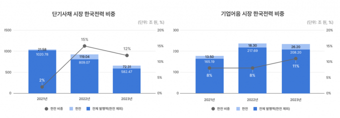 한전발 금융불안은 채권시장뿐 아니라 단기사채, 기업어음 시장까지 번질 가능성도 제기되고 있다. 회사채 발행에 제약을 받고 있는 한전은 단기사채와 기업어음을 늘려왔기 때문이다. 단기사채 시장에서 한전이 차지하는 비중은 2021년 2%에서 2022년 15%로 급증했고, 2023년에는 12%를 차지했다. 기업어음 시장에서 한전의 비중은 2021년과 2022년 8% 수준에서 2023년 11%로 늘었다. 한전이 채권시장뿐 아니라 사채와 어음시장의 도화선이 될 수 있음이다.