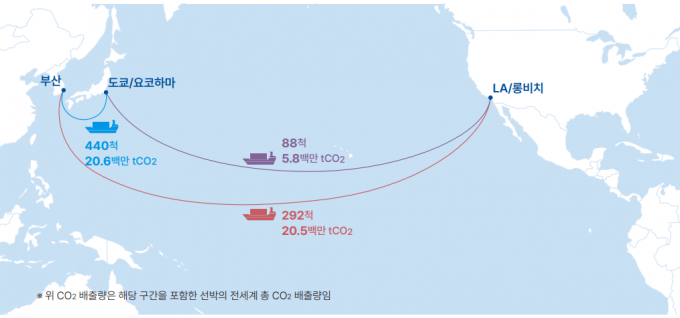 분석 결과, 부산~도쿄/요코하마항으로 기항하는 항로(선박 440척 기항)의 탄소배출량이 2062만톤으로 가장 많았고, 부산~LA/롱비치항 항로(선박 292척 기항)이 2060만톤으로 2위를 차지했다. 이어 부산~뉴욕/뉴저지 항로가 1810만톤으로 3위를 기록했다.