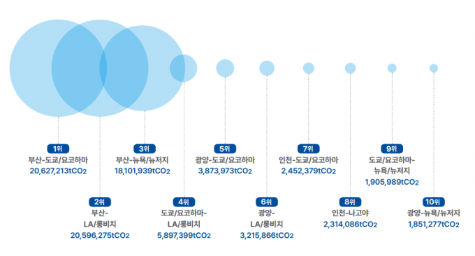 이밖에 부산~도쿄/요코하마항~LA/롱비치항(590만톤), 광양~도쿄/요코하마항(387만톤), 광양~LA/롱비치항(322만톤), 인천~도쿄/요코하마항(245만톤), 8위 인천~나고야항(231만톤), 도쿄/요코하마~뉴욕/뉴저지항(190만톤), 광양~뉴욕/뉴저지항(185만톤)으로 탄소배출량이 많았다.