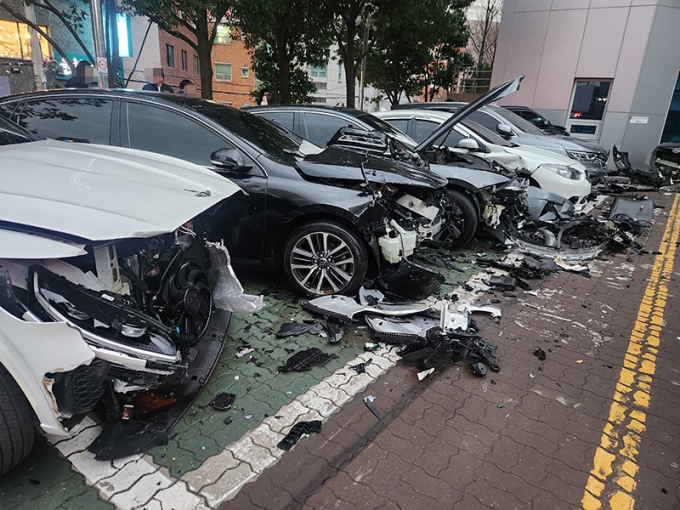해당 승용차는 주차된 차들의 앞부분을 부수며 직진하다가 제자리에서 한 바퀴 돌고 구청 건물을 들이받고 나서야 멈췄다.