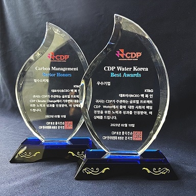 KT&G 관계자는 "글로벌 스탠더드에 발맞춘 기후변화 대응과 체계적인 수자원 관리 역량을 인정받아 CDP로부터 우수기업에 선정됐다"며 "향후에도 순환경제 전환 가속화에 앞장서는 등 진정성 있는 ESG경영을 추진할 것"이라고 밝혔다.