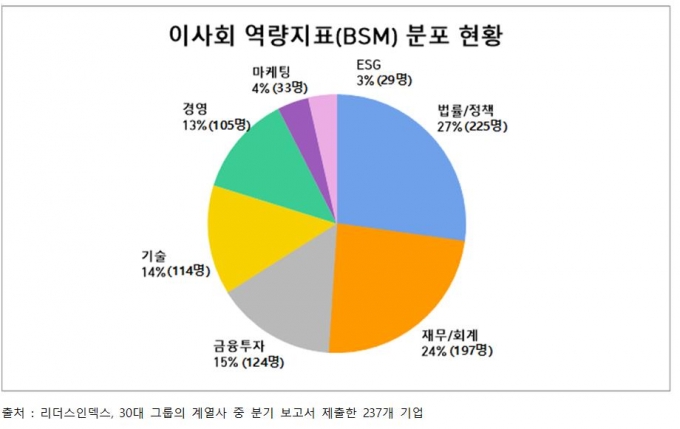 리더스인덱스는 경영, 금융투자, 재무·회계, 법률·정책, 기술, 마케팅, ESG 등 7개 공통 분야에 따라 각 기업이 공시한 사외이사 선임 배경을 토대로 조사를 진행했다. 선임 배경을 공시한 기업은 192곳이었으며, 공시하지 않은 45개사의 경우 사외이사 개인 이력을 기준으로 삼았다.