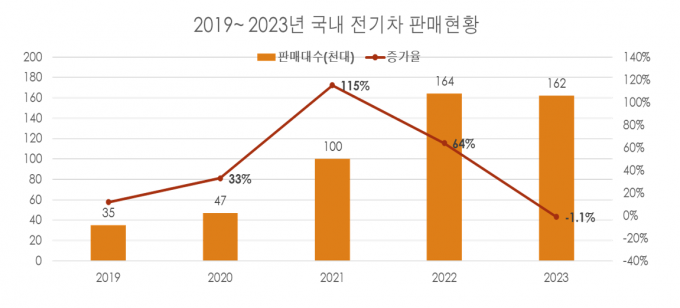 그러나 우리나라는 지난해 전기차 판매량이 늘어나기는커녕 오히려 감소했다. 전세계 추세와 비슷하게 가던 우리나라 전기차 판매 증가율은 지난해 1.1% 역성장했다. 전기차 판매대수는 16만2000대로 전년보다 2000여대(-4%) 줄었다. 이는 미국이 37만대(49%), 유럽연합(EU) 60여만대(38.3%), 중국이 무려 133만7000여대(25%), 일본이 2만8000대(46%) 더 늘어난 것과 대조를 보였다.