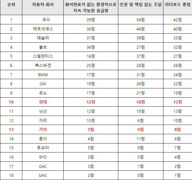 28일 완성차업체들의 공급망 탈탄소 및 인권경영 독려 캠페인 '리드더차지'(Lead the Charge)가 전세계 18개 완성차업체들의 기후·인권 대응을 분석해 공개한 순위에서 현대자동차는 10위, 기아는 13위를 기록했다. 전기자동차 판매량은 많지만, 저탄소 철강 조달계획이 전무하다는 점이 감점 요인으로 작용했다는 분석이다.