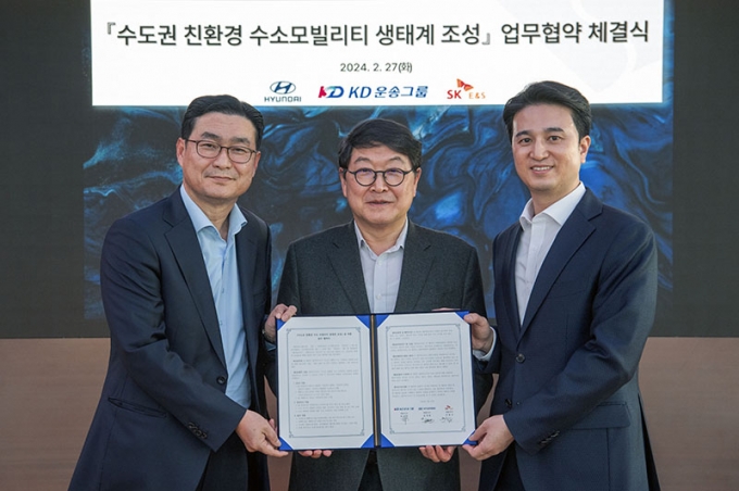 이들 3사는 지난 27일 SK 서린사옥에서 '수도권 친환경 수소 모빌리티 생태계 조성'을 위한 업무협약을 체결했다고 28일 밝혔다. 이날 행사에는 추형욱 SK E&S 대표, 허상준 KD운송그룹 대표, 정유석 현대자동차 부사장 등이 참석했다.