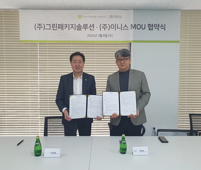 그린패키지솔루션은 자사의 친환경 브랜드 'YUMU' 제품을 이니스의 특판계약 대상인 상조기업에 납품하기 위해 유통기업 이니스와 업무협약(MOU)을 체결했다고 7일 밝혔다.
