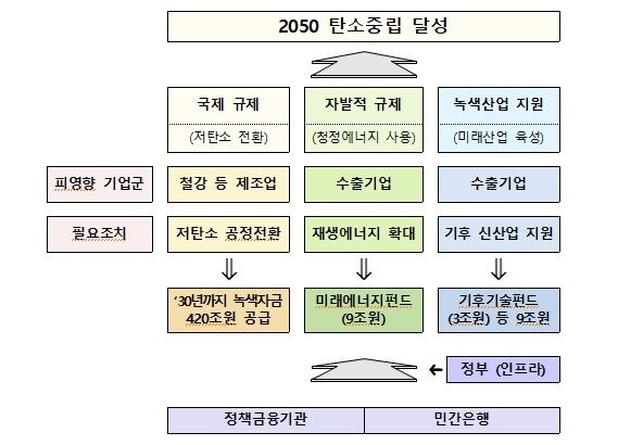 정부가 우리 기업들의 저탄소 전환에 필요한 자금을 지원하기 위해 2030년까지 총 420조원의 정책자금을 조달할 계획이다. 올해부터 1년에 60조원씩 녹색자금을 지원하겠다는 의미다. 재생에너지 증설에 필요한 자금을 조달하기 위해 시중은행들은 2030년까지 9조원 규모의 '미래에너지펀드'를 조성해 자금줄 역할을 할 예정이고, 3조원 규모의 '기후기술펀드'와 5조원 규모의 '혁신성장펀드' 그리고 1조원 규모의 '성장사다리펀드'를 조성해 녹색투자를 확대해나가기로 했다.