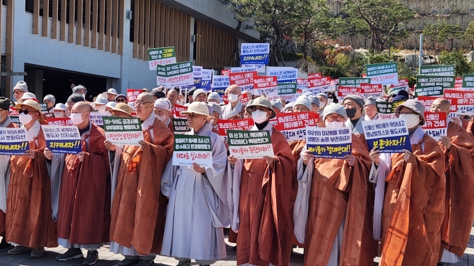 21일 영축총림 통도사는 21일 오후 울산시 울주군청 앞에서 '영남알프스 케이블카 반대 궐기대회'를 열었다. 이날 집회에는 승려와 신도, 영남알프스 케이블카 반대 범시민대책위원회 회원 등 약 300명이 참가했다.