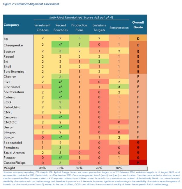 연구진들은 조사대상 기업의 화석연료 탐사 및 생산계획 및 투자, 탄소배출량 감축목표, 임원급 이사들의 주요 경영정책을 조사하고, 그 결과를 파리협약 준수 점수표와 대조했다. 그리고 각 기업에 A~H까지 등급을 매겼다. 연구진들은 "A는 파리협약 목표에 잠재적으로 부합하는 기업을 뜻하고, H는 가장 부합하지 않는 기업을 의미한다"고 말했다.