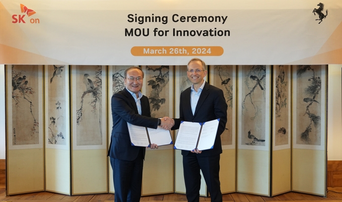 SK온은 지난 26일 서울 종로구 SK서린사옥에서 페라리와 '배터리셀 기술혁신을 위한 업무협약'(MOU)을 체결했다고 27일 밝혔다. 협약식에는 SK온 이석희 사장, 성민석 최고사업책임자(CCO), 이장원 최고기술책임자(CTO)와 페라리 베네데토 비냐(Benedetto Vigna) 최고경영책임자(CEO), 에르네스토 라살란드라(Ernesto Lasalandra) 최고연구개발책임자(Chief R&D Officer) 등이 참석했다.