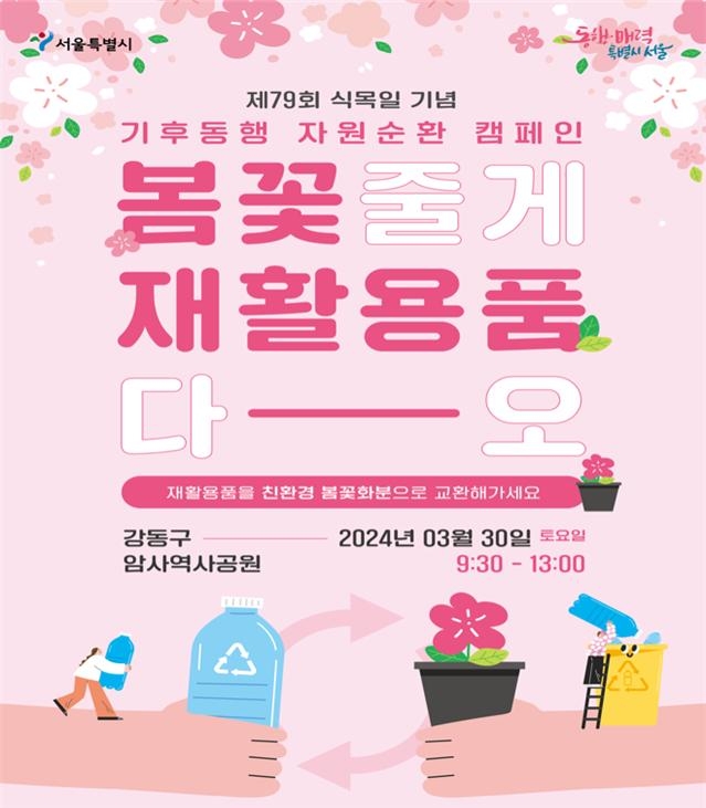 서울시는 오는 30일 오전 9시30분 강동구 암사역사공원에서 제79회 식목일을 기념해 '기후동행 자원순환 캠페인'을 펼친다고 28일 밝혔다.