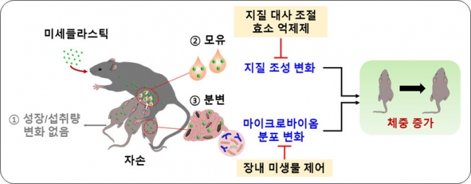 연구팀은 생활용품에 주로 쓰이는 폴리스타이렌(PS)과 폴리프로필렌(PP)을 어미 생쥐에게 먹인 후 새끼 생쥐에게 수유한 뒤 신진대사 영향을 관찰했다. 그 결과, 초미세플라스틱에 노출된 어미 생쥐의 젖을 먹은 새끼 생쥐들은 몸무게와 체지방이 두드러지게 증가하는 현상이 나타났다.