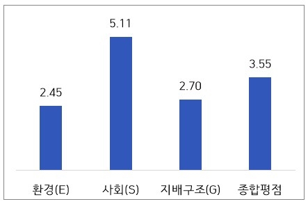 대한상공회의소가 국내 공급망에 속한 중소·중견기업 1278개사의 2022~2023년 ESG 실사 데이터 분석결과, ESG 경영수준을 점수화 했을 때 환경(E)은 2.45점, 사회(S)는 5.11점, 지배구조(G)는 2.70점을 기록했고, 종합평점은 3.55점으로 나타났다.