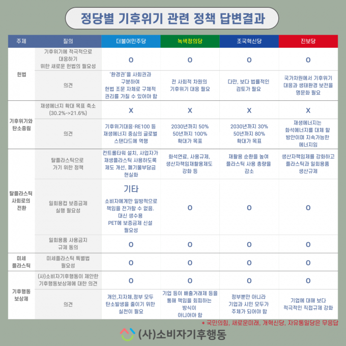 4일 소비자기후행동은 현역 국회의원이 1명 이상 있는 정당의 중앙당과 선거관리위원회에 등록된 후보자를 대상으로 기후위기 관련 정책을 질의한 결과를 공개했다. 질의 내용은 △국가의 기후위기 책임 및 역할을 담은 헌법 개정 필요성 △온실가스 저감 및 재생에너지 확대 방안 △탈플라스틱 전환 △기후행동보상제 등이다.
