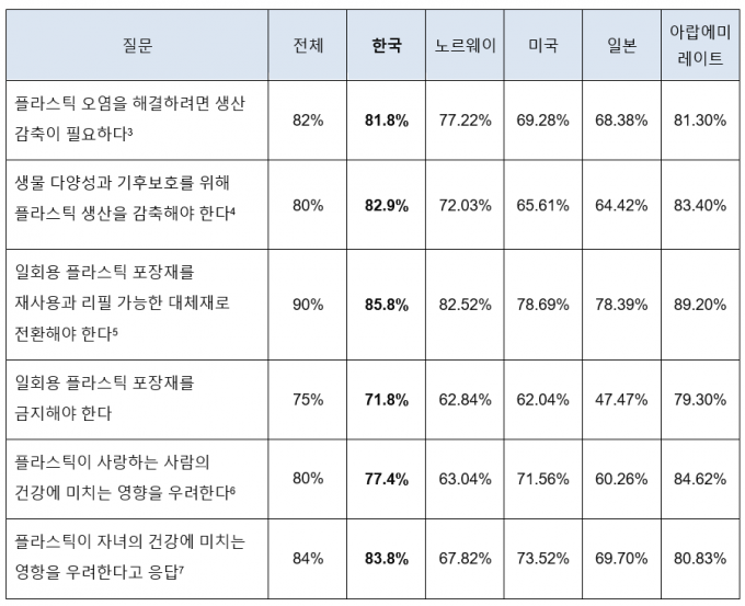 한국 역시 '플라스틱 생산 감축'에 대한 지지를 표한 시민 비중이 81.8%를 차지하고, '일회용품 플라스틱 포장재의 재사용 및 리필 가능한 포장재로의 전환' 항목에도 응답자의 85%가 동의했다.