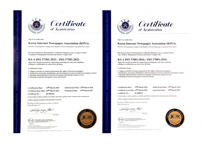 한국인터넷신문협회는 규범준수 경영시스템 'ISO 37301'과 부패방지 경영시스템 'ISO 37001' 통합인증을 취득했다고 5일 밝혔다.