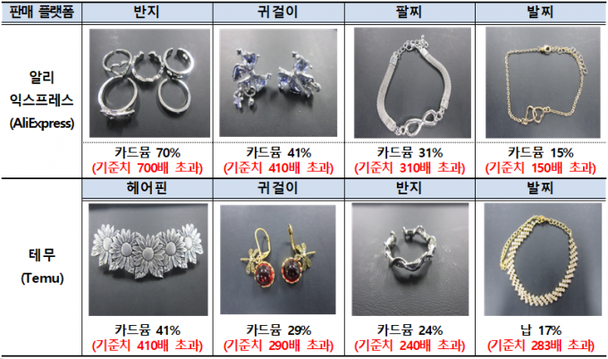 중국 해외직구플랫폼인 알리익스프레스와 테무에서 판매되는 초저가 장신구가 국내 안전기준치를 최대 700배 초과하는 발암물질 범벅인 것으로 나타났다.