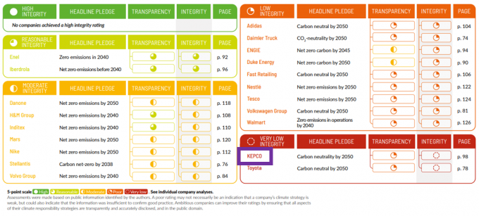 '정합성'은 기후위기 대응목표가 실현가능한지, 실현된다 하더라도 실제로 기후위기 대응에 효과가 있는지를 나타낸다. 이번 보고서가 평가한 20개 기업 가운데 가장 낮은 등급인 '정합성 매우 낮음'을 받은 기업은 한전과 도요타 2곳뿐이다.