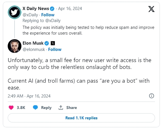 X는 앞서 지난 10월 뉴질랜드와 필리핀에서 검증되지 않은 신규 이용자에게 '로봇이 아닙니다' 인증프로그램을 적용하고 연간 1달러의 이용료를 부과해왔다. 당시에도 머스크는 이 프로그램이 스팸성 계정을 막아줄 수 있을 것이라고 홍보했다.