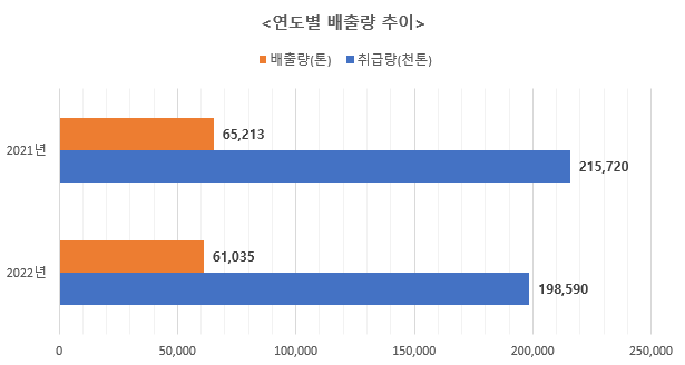 화학물질 배출량은 전년보다 4177톤(6.4%) 감소했다. 3813개 업체가 227종의 화학물질 21만5721톤을 취급했던 전년보다 취급량도 7.9% 감소했다. 취급량 대비 배출량 비율은 2021년 30.2%에서 2022년 30.7%로 조금 높아졌다.