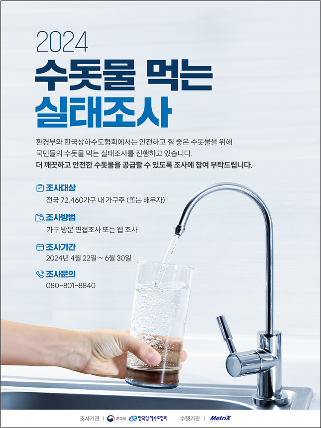 안전하고 깨끗한 수돗물 공급하기 위해 22일부터 오는 6월 30일까지 전국 7만2460가구를 대상으로 '수돗물 먹는 실태조사'가 실시된다.