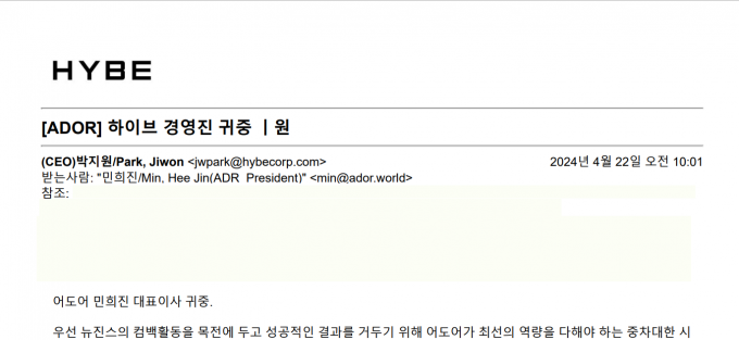 26일 하이브는 전날 민 대표가 2시간 넘게 진행한 기자회견·인터뷰서 언급한 12가지 주장을 반박하며 박지원 최고경영자(CEO)가 보낸 이메일 기록까지 공개했다.