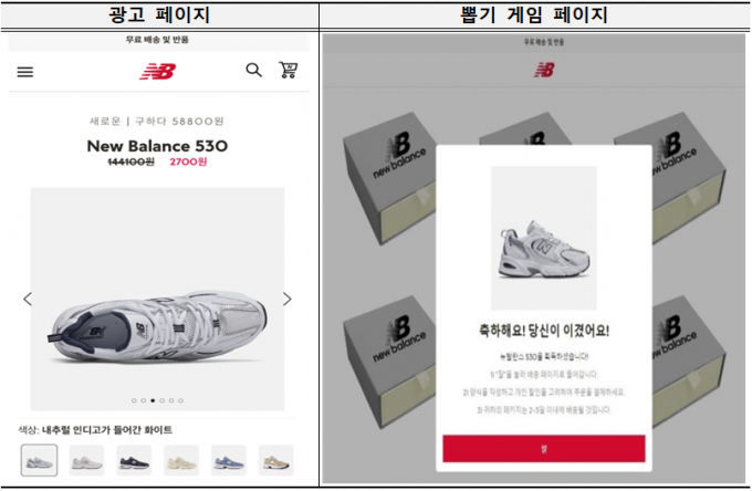 광고의 링크를 통해 접속한 웹페이지에서는 6개 상자 중 운동화가 들어있는 상자를 찾는 '뽑기 게임'에 참여하도록 유도했다. 그러나 이 게임은 참여자 모두 성공하도록 돼 있고, 소비자가 마치 초저가에 운동화를 구매할 기회에 당첨된 것처럼 하면서 구매를 유도했다.