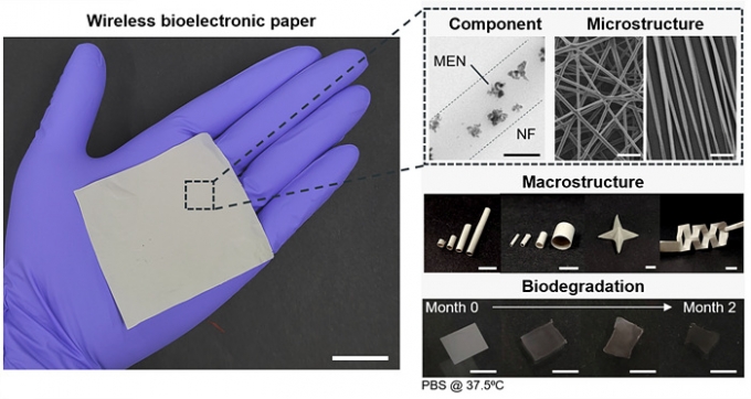울산과학기술원(UNIST) 신소재공학과 김지윤, 차채녕, 송명훈 교수연구팀은 종이처럼 유연하고 생분해까지 가능한 '종이형 전기자극 물질'을 세계 처음으로 개발했다고 9일 밝혔다. 나노 재료를 사용했기 때문에 자르거나 접어도 기능을 잃지 않고 사용할 수 있다.