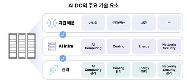 'AI 인프라' 모듈은 AI프로세서, 메모리, 스토리지와 차세대 냉각기술, 에너지 효율화 솔루션, 보안 등의 기술요소들에 대해 '관리' 모듈은 AI DC 인프라의 관리와 관련된 기술요소들을 담고 있다. '자원 배분'은 AI DC내 자원 가상화 및 자원할당, 인증 등을 담당하는 기술요소들에 대한 모듈이다.