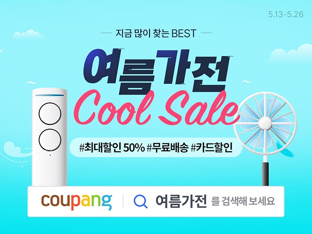 쿠팡이 에어컨·선풍기 등 여름나기를 위한 가전제품을 대폭 할인 판매하는 '여름가전 쿨세일' 기획전을 오는 26일까지 진행한다고 14일 밝혔다. 와우 멤버십 회원들은 제품 하나만 사도 무료배송을 포함해 최대 50% 할인 및 카드할인 혜택을 누릴 수 있다.