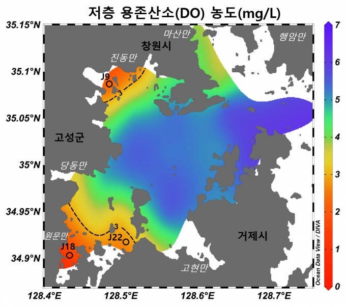 해양수산부 국립수산과학원은 지난 22~23일 현장조사를 실시한 결과 용존산소 농도 1.55~2.83 mg/L의 산소부족 물덩어리가 진해만 해역 저층에서 관측됐다고 밝혔다.
