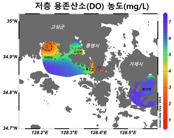이같은 사실은 지난 3~5일 수과원의 현장조사 결과로 밝혀졌으며 가막만, 북신만, 자란만 해역의 저층에서 각각 용존산소 농도 2.67 mg/L, 2.54~2.91 mg/L, 2.67~2.88 mg/L인 산소부족 물덩어리가 관측됐다.