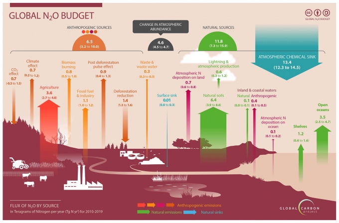 미국 보스턴칼리지 연구진이 이끄는 글로벌 탄소프로젝트 연구팀은 12일 육상과 해양 및 담수, 대기 시스템의 질소 순환 모델과 1980~2020년까지 측정치를 이용해 아산화질소 배출량을 분석한 결과, 자연배출량은 대동소이했지만 인간활동으로 인한 아산화질소 배출량은 40%(약 300만톤)가량 증가했다고 밝혔다.