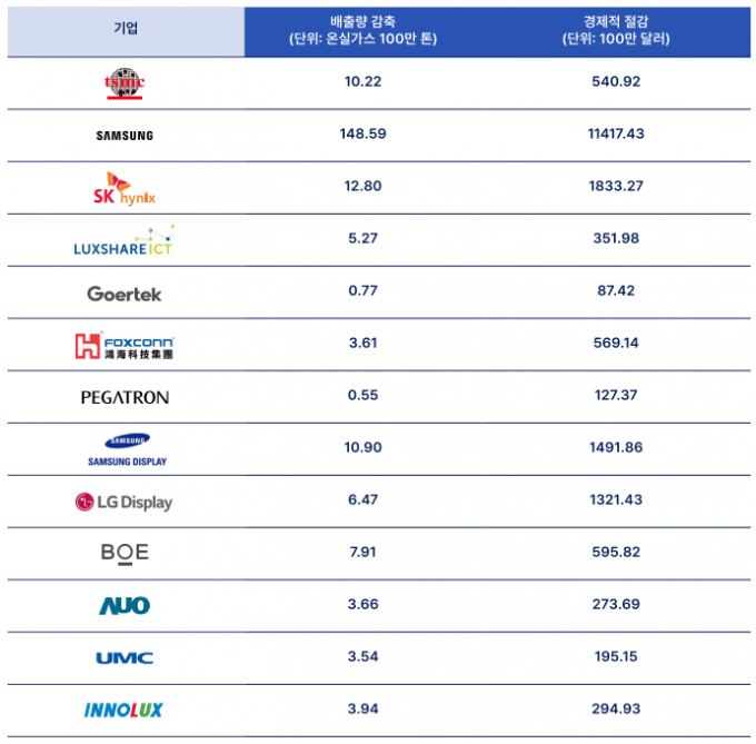 동아시아 테크기업 13곳 가운데 한국기업은 삼성전자와 SK하이닉스, 삼성디스플레이, LG디스플레이 4곳이지만, 전력수요는 가장 많아 RE100에 따른 비용편익 1~4위가 모두 한국기업일 정도로 절감액이 가장 크다는 분석이다.