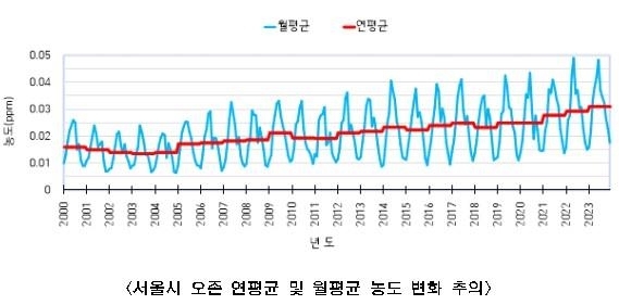 서울시 연평균 기온은 2000년 12.7℃에서 2023년 14.1℃로 상승했다. 오존 생성이 유리한 여름일수도 2000년 61일에서 2023년 66일로 늘었다. 일사량도 2000년 면적당 3902메가줄(MJ)에서 2023년 5747MJ로 증가했다. 이에 따라 2000년에는 8일 22회였던 오존주의보 발령 일수와 횟수는 2023년 14일 45회까지 늘어났다.