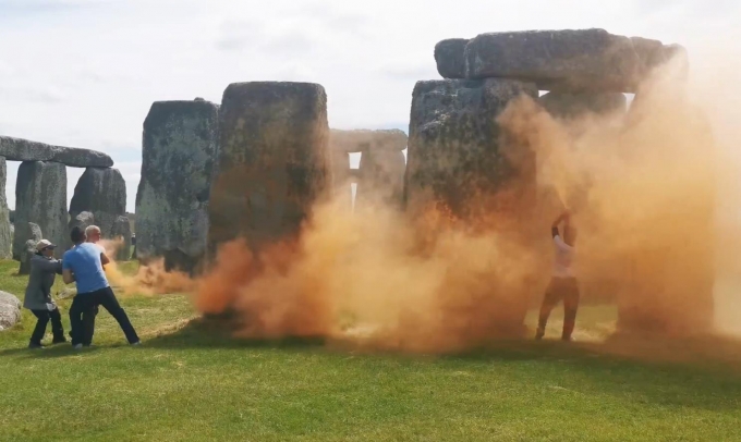 19일(현지시간) 저스트스톱오일은 엑스(X·옛 트위터)에 단체의 활동가들이 윌트셔 솔즈베리 평원에 있는 스톤헨지에 물감을 분사하고 체포되는 모습을 찍은 영상을 올렸다.