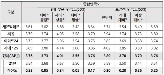 특히 편의점에서 판매하는 제품이나 제공하는 주요 서비스의 만족도'가 가장 크게 개선된(3.67점→4.01점) 것으로 나왔다. 다만 편의점의 환경이나 고객대응 등을 평가하는 서비스 품질(3.68점→3.73점)과 편의점 이용과정 중에 느낀 감정을 평가하는 서비스 체험(3.50점→3.55점)에 대한 만족도는 개선 수준이 상대적으로 낮았다.