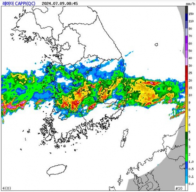 동서로 좁고 길게 형성된 띠구름대가 걸쳐져 있는 전북과 경북남부, 경남북부는 9일 호우특보가 내려진 상태다. 현재 이 지역은 시간당 10~50㎜의 폭우가 내리고 있다.