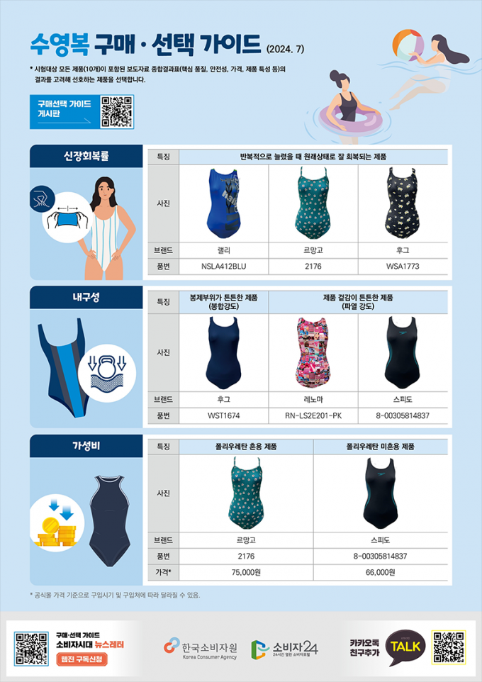 여성수영복별로 가격은 2배 정도 차이가 나고 내구성 등 성능도 차이가 있는 것으로 나타나, 구입할 때 소비자들의 꼼꼼한 비교가 필요해보인다.