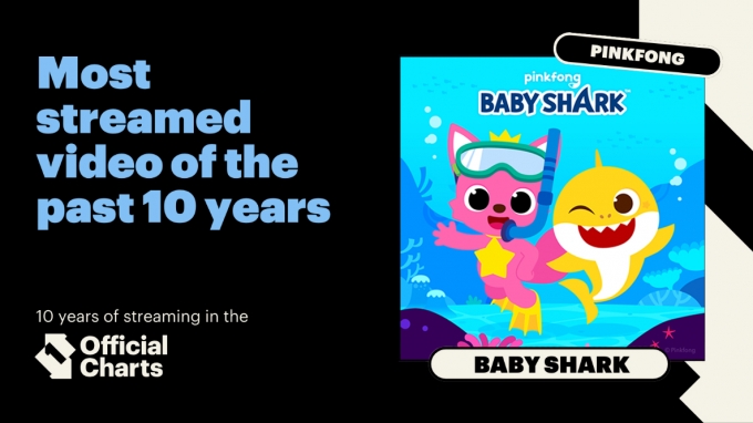 미국 빌보드와 함께 세계 양대 음악 차트로 꼽히는 영국 오피셜 차트는 2014년 스트리밍 데이터를 차트에 반영한 이후 올해 10주년을 맞아, 스트리밍 시대에 최고의 인기를 누리고 있는 음악 순위를 발표했다. 17일(현지시각) 발표에 따르면 '핑크퐁 아기상어'는 영국에서만 2억 7196만 건이 넘는 스트리밍 횟수를 기록하며 가장 많이 스트리밍된 MV 1위에 등극했다.