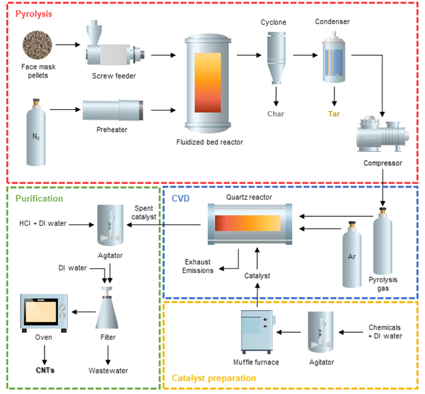 열분해(Pyrolysis)는 무산소 및 고온 조건에서 화합물을 분해해 두 가지 이상의 새로운 물질을 생산하는 반응으로, 플라스틱과 같은 유기 고분자의 열분해는 일반적으로 300℃ 이상에서 수행되며 가스, 오일, 고체 잔여물이 생성된다. 연구팀은 마스크 폐기물을 열분해시켜 메탄, 에틸렌, 프로필렌 등의 탄화수소 가스로 변환시킨 다음, 이를 고온에서 처리해 탄소나노튜브로 전환했다.