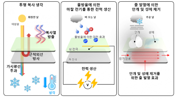 연구팀이 개발한 '다기능 스마트 창문'은 일반 창문보다 실내온도를 약 7℃가량 낮출 수 있는 것으로 확인됐다. 또 비가 내리는 환경을 모사한 실험에서 빗방울 하나로 8.3와트(W)의 전력을 생산했고, 발열을 통해 일반 창문보다 2배 빠른 속도로 성에를 제거할 수 있었다.