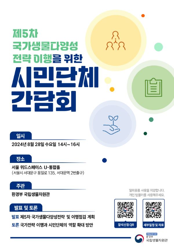환경부 소속 국립생물자원관이 28일 서울 서대문구 위드스페이스에서 '제5차 국가생물다양성전략 이행을 위한 시민단체 간담회'를 개최한다.