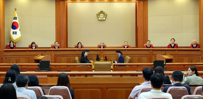 ▲이종석 헌법재판소장을 비롯한 헌법재판관들이 29일 오후 헌법소원·위헌법률 심판이 열린 서울 종로구 헌법재판소 심판정에 입장해 착석하고 있다. (사진=연합뉴스)