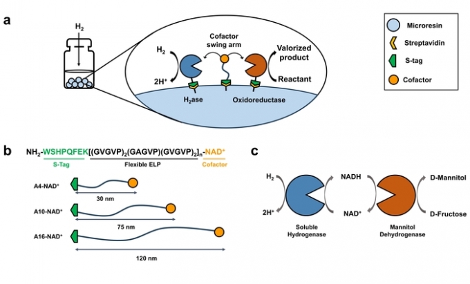 이 문제를 해결하기 위해 연구팀은 별도 정제과정없이 수소 자원을 이용할 수 있는 친환경 다중 효소 생촉매를 개발한 것이다. 일반적인 무기물 촉매는 폐가스에 포함된 다양한 성분에 접하면 기능이 크게 감소한다. 하지만 연구팀이 개발한 생촉매는 이 기능이 유지된다. 수소화효소와 만니톨 환원 효소 사이를 보조인자로 연결해 폐가스와 과당으로부터 의약품인 만니톨을 생산하는 생촉매를 설계한 것이다.